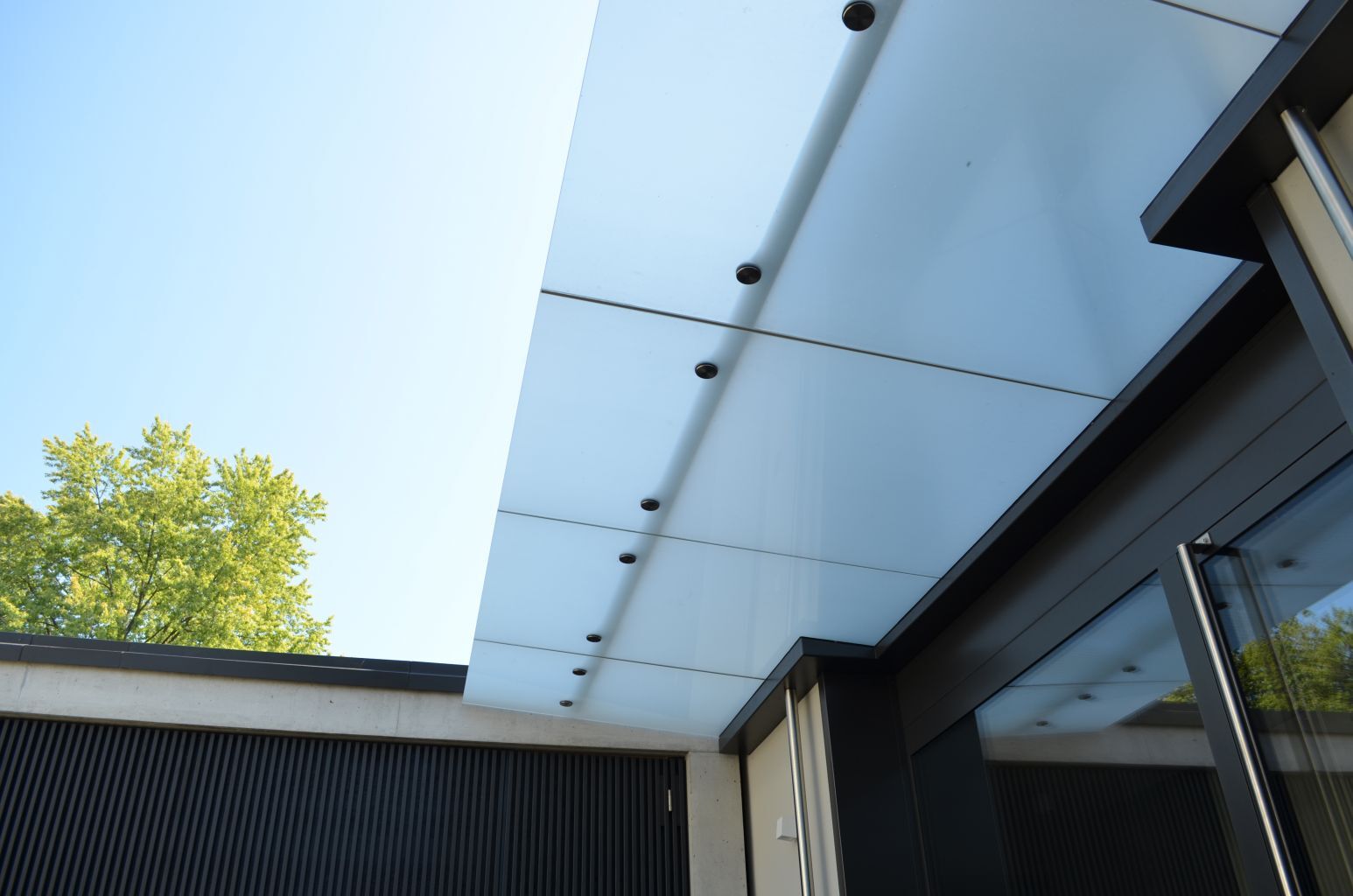 - Glasvordächer an Wand befestigt und auf Stützen aufgelagert