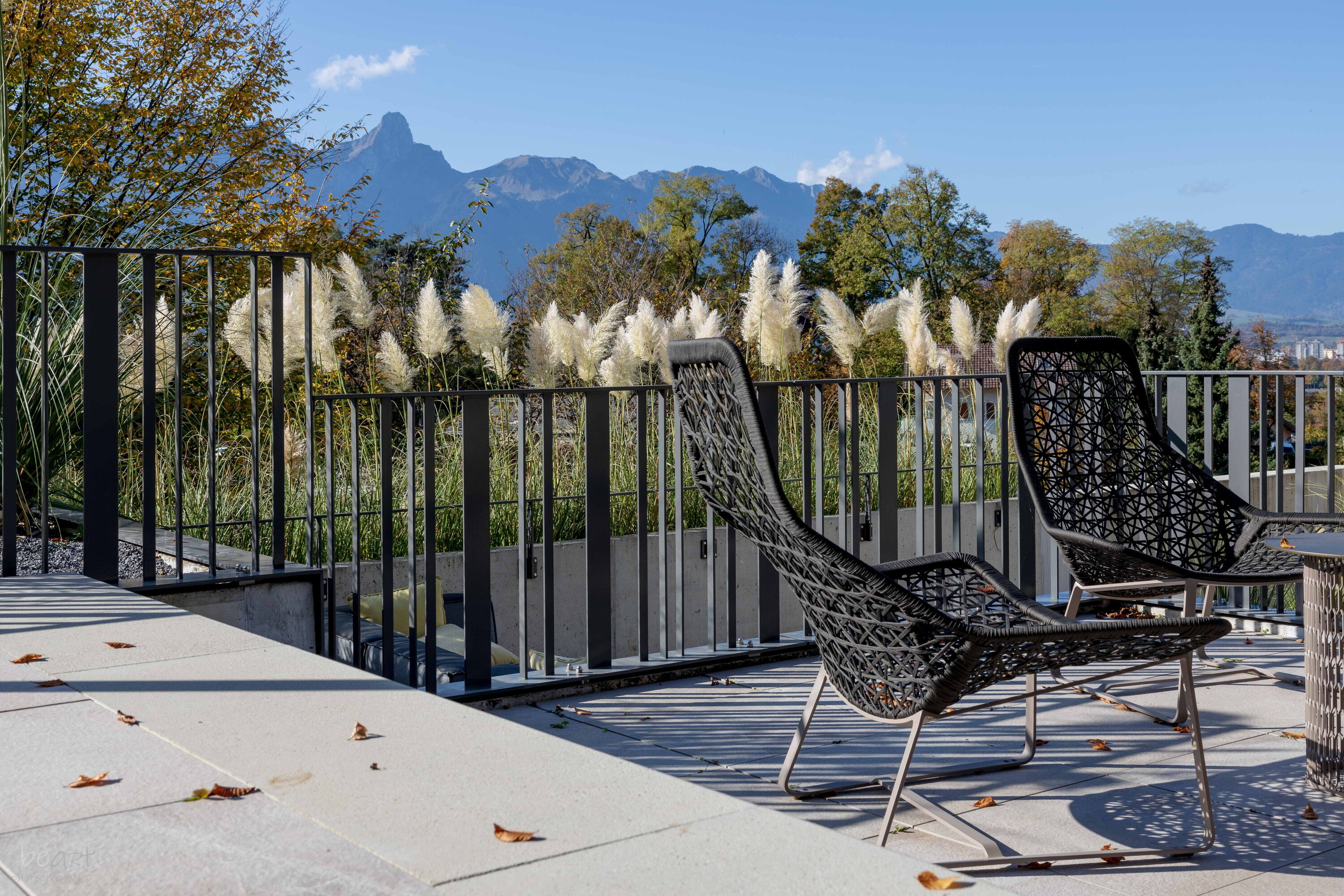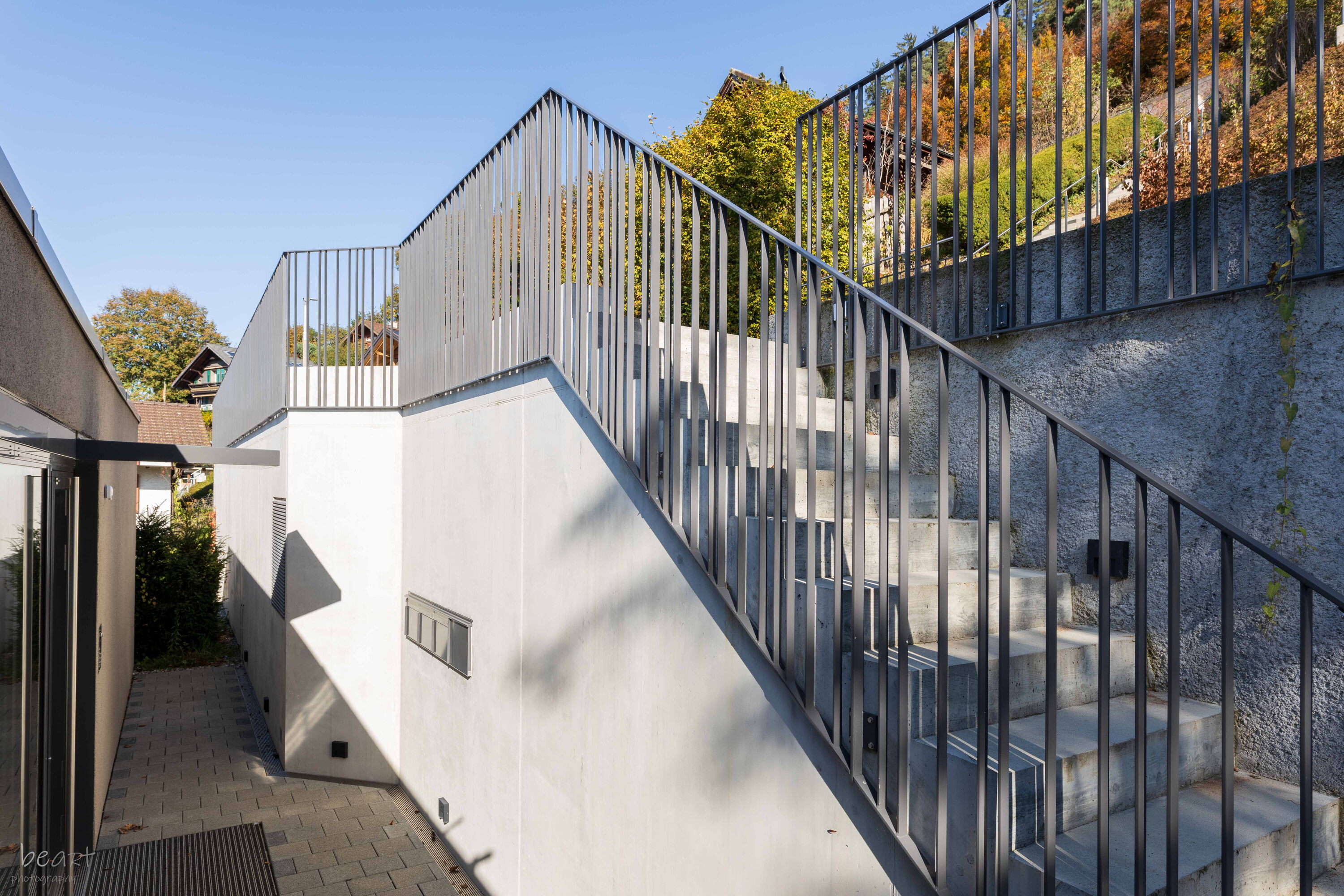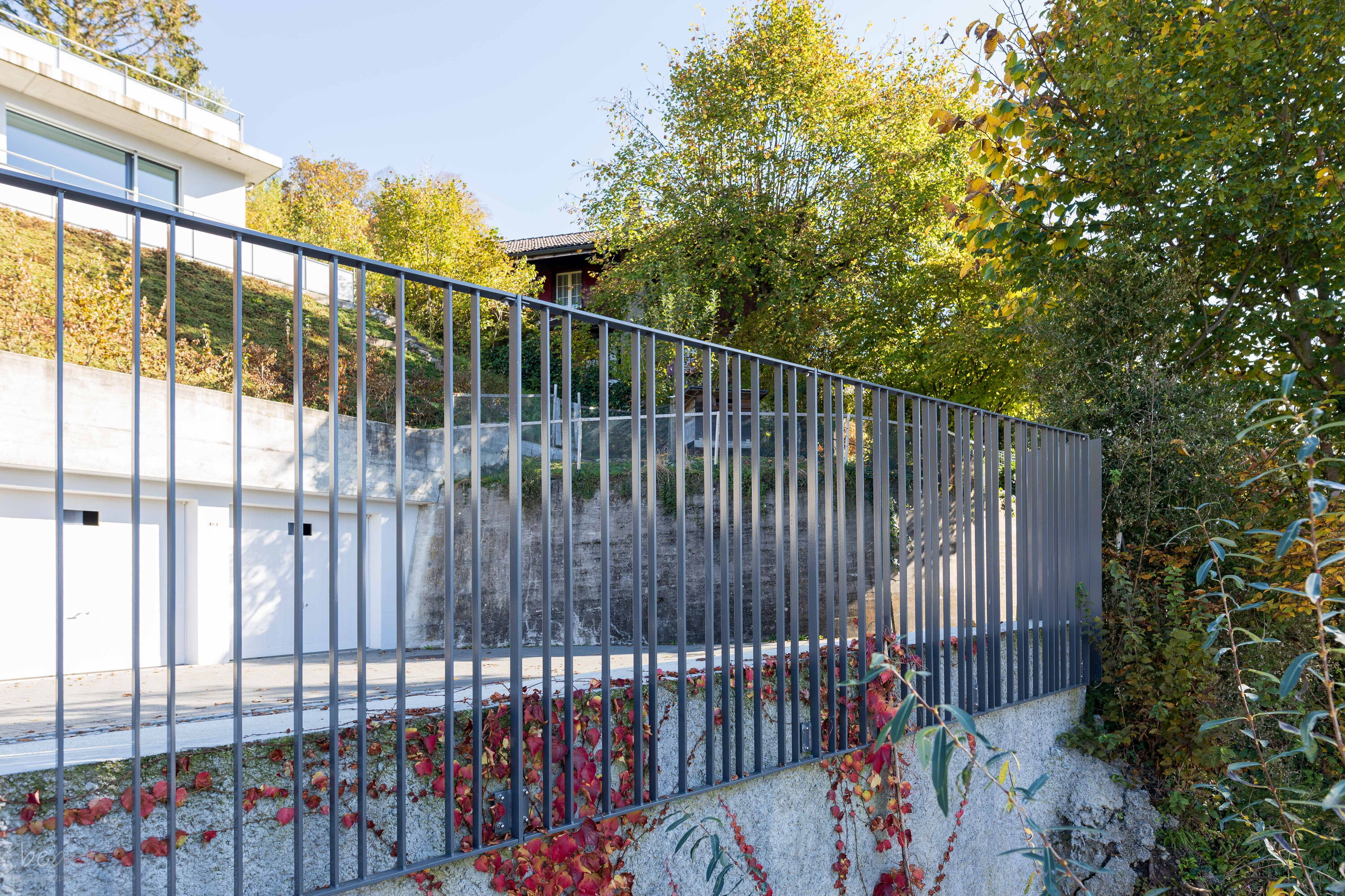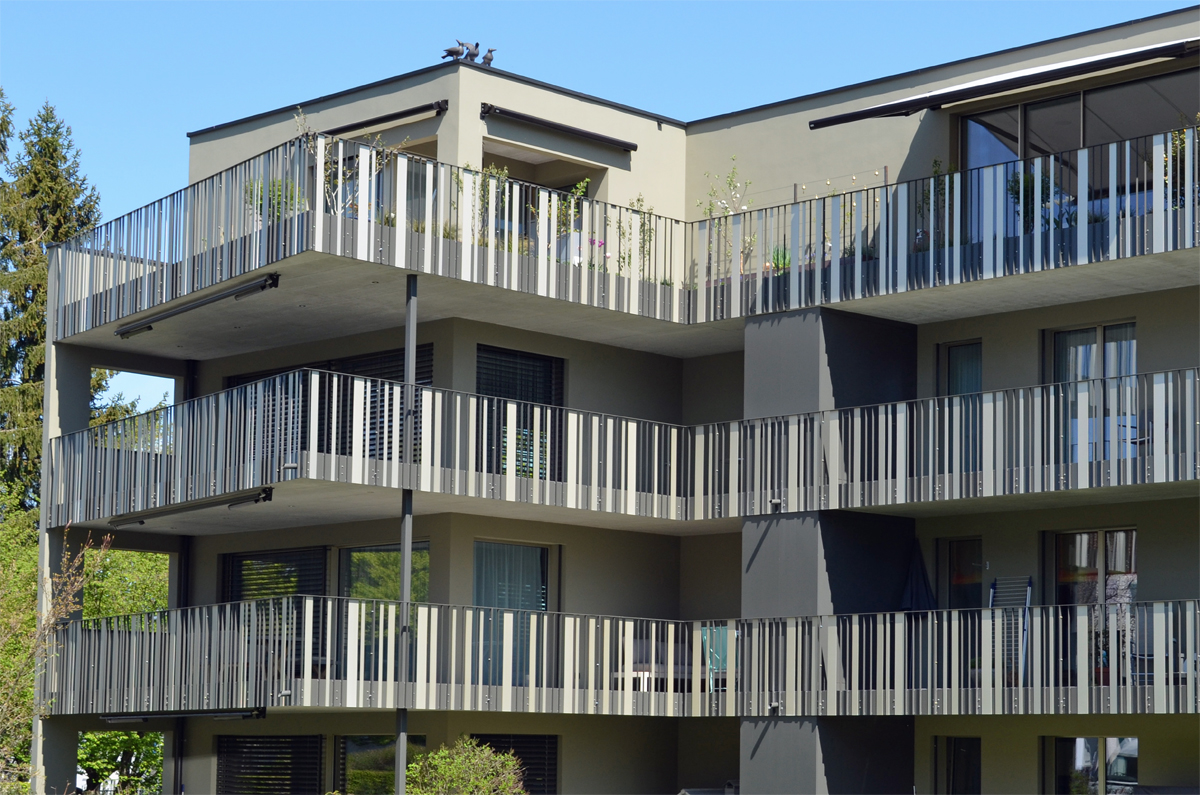 Geschlossene Geländer: Geschlossene oder halbtransparente Geländer bieten zusätzlich Diskretion und Sichtschutz. Dank unseren Möglichkeiten in der Blechverarbeitung stehen Ihnen viele Gestaltungsmöglichen offen.