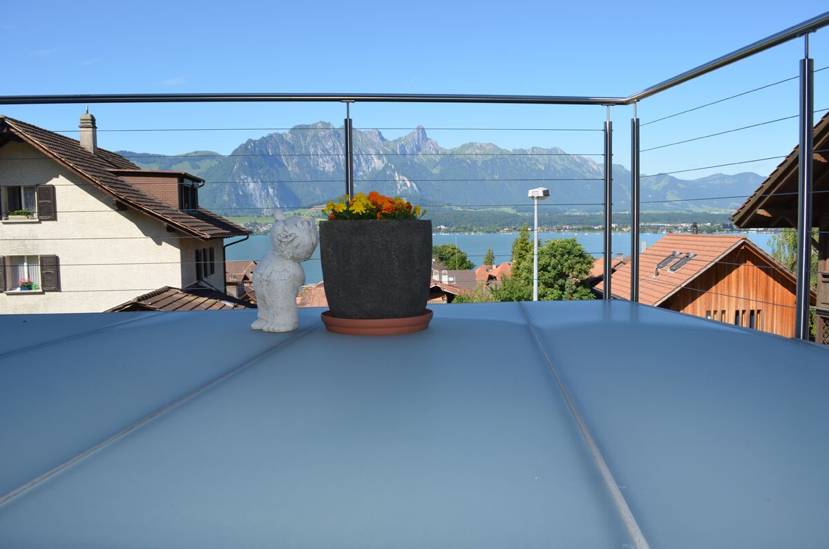 Balkonkonstruktionen in Stahl/ Beton: Die modulare, mittelschwere Bauweise dieser Balkonkonstruktion ist ideal, wenn massive und geschlossene Bodenplatten gewünscht sind. Sämtliche Ausbaumöglichkeiten, mit Windschutz- und Sichtschutzelementen, teil- oder vollverglast stehen zur Auswahl. Ein besonderer Vorteil der Betonbodenplatte ist der Wärmespeicher im Sommer. Noch am späten Abend gibt diese die Wärmestrahlung wieder zurück.
