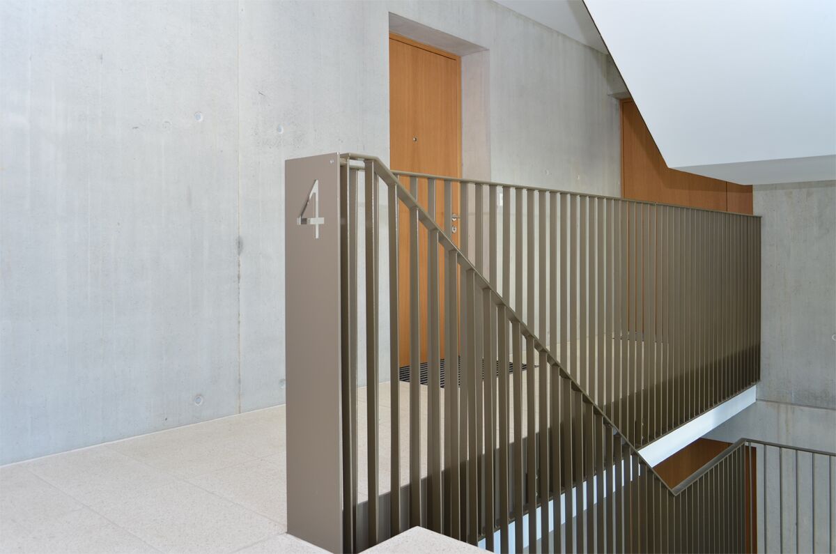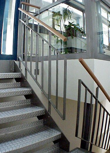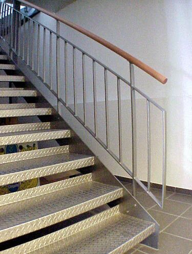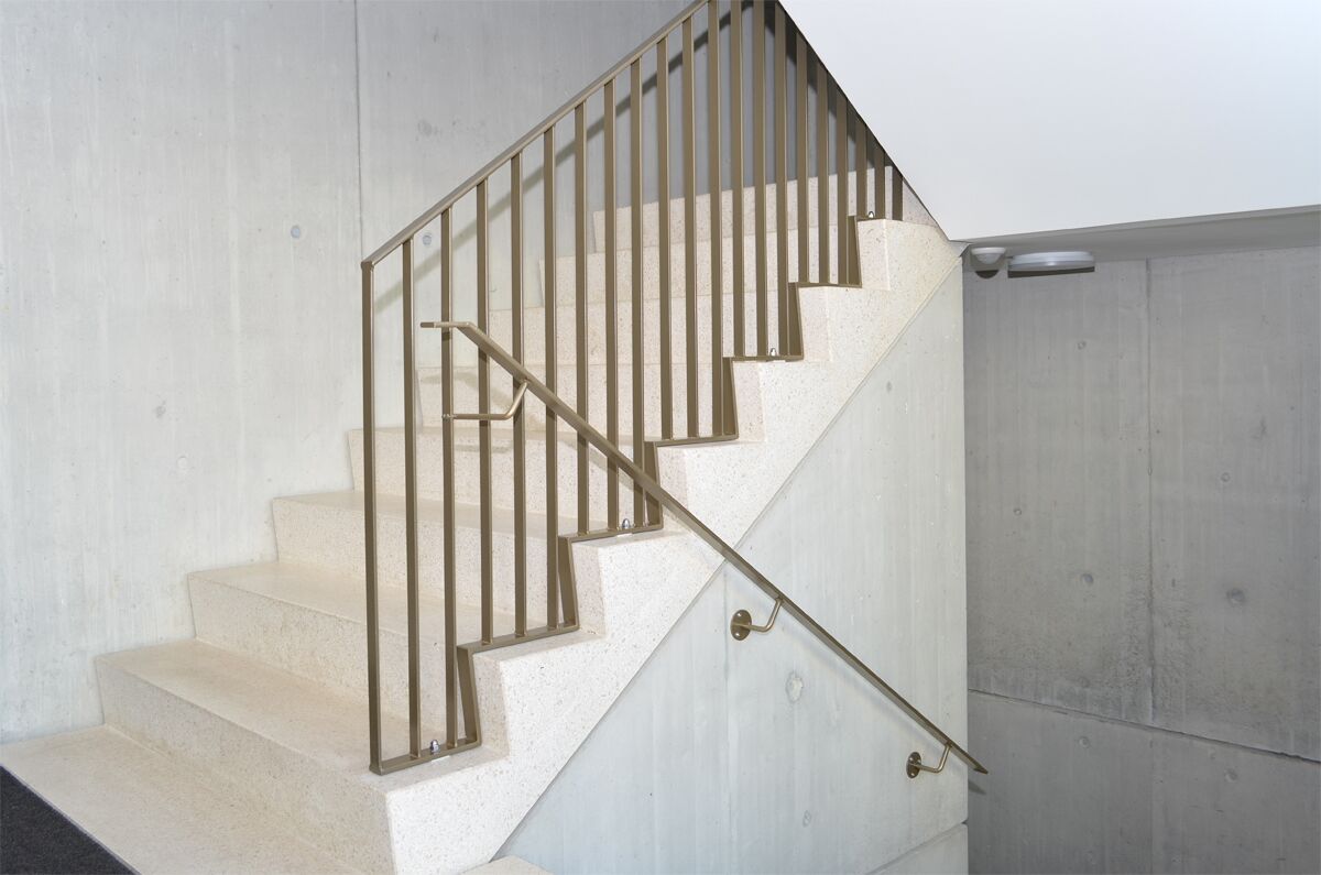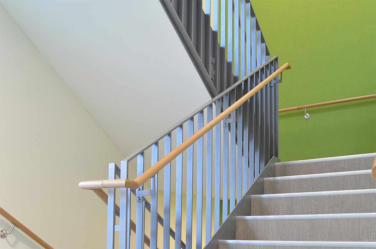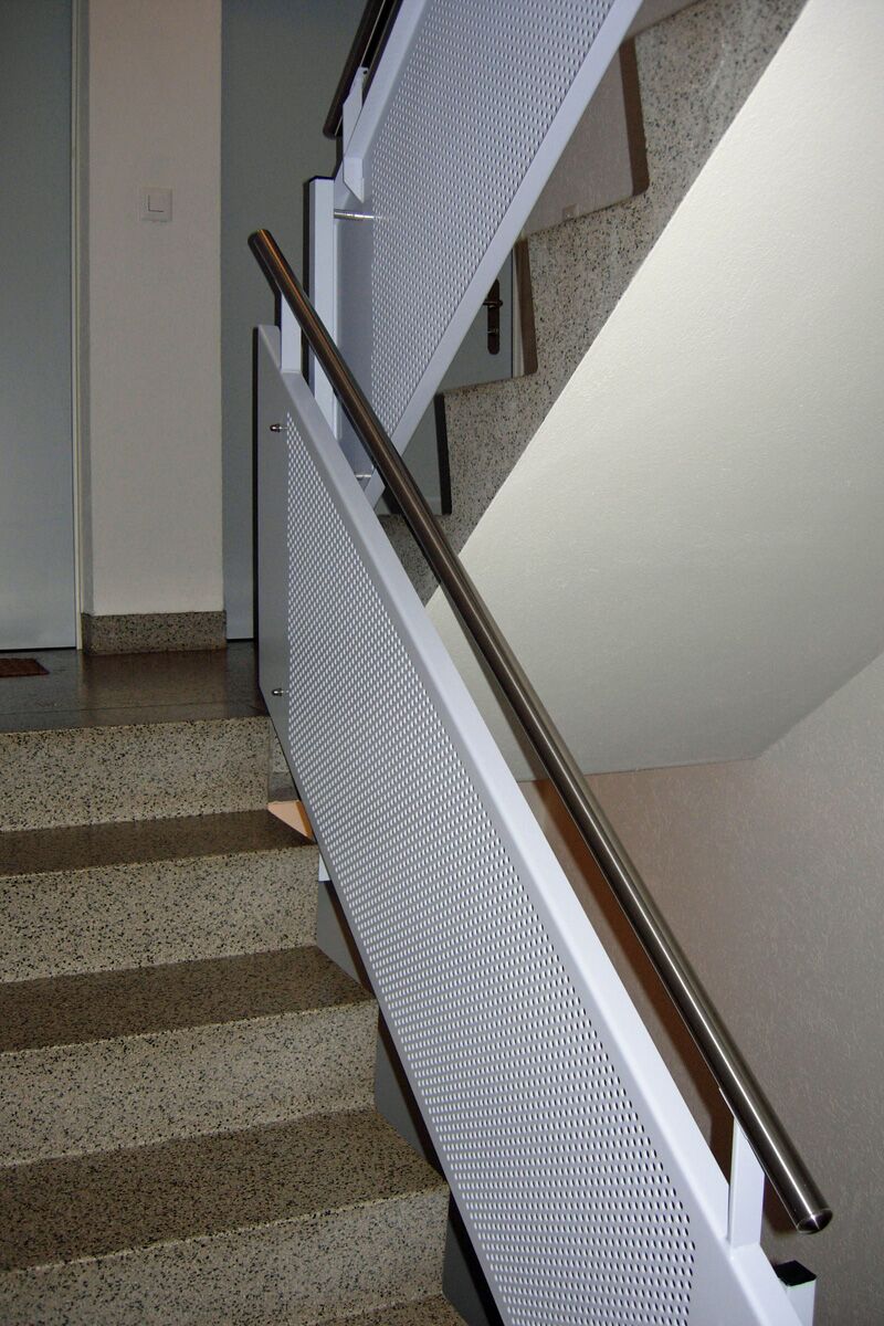 Kostengünstige Geländer im Treppenhaus werden oft als Staketengeländer ausgeführt. Möglich sind jedoch auch Geländer mit ganz oder teilweise geschlossenen Füllungen