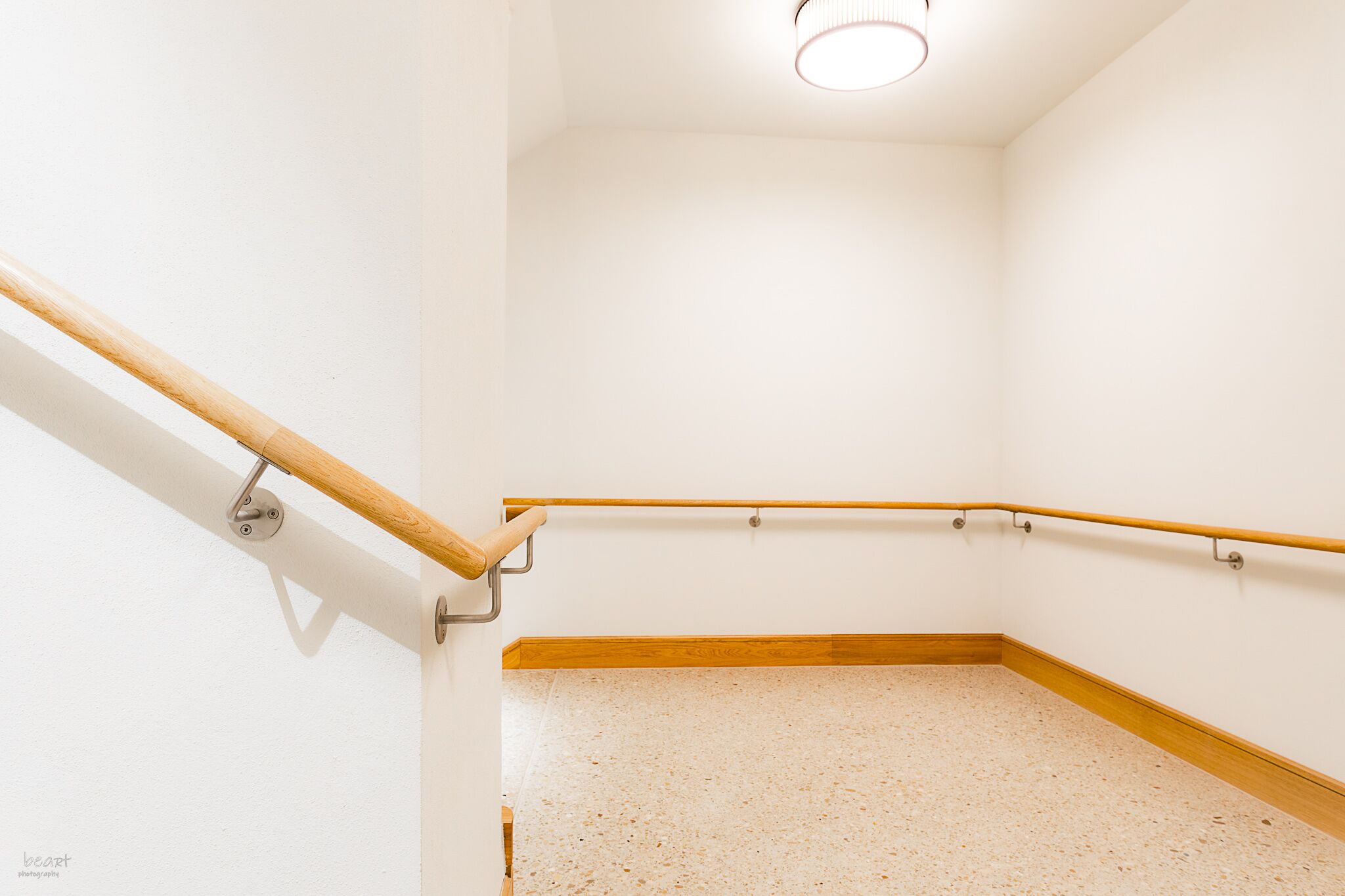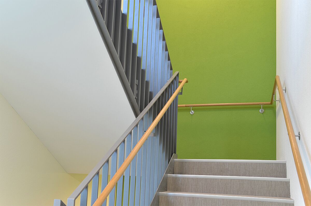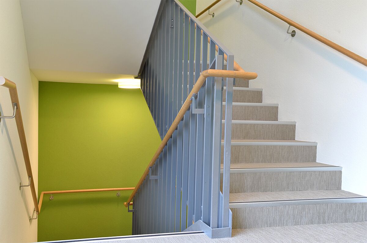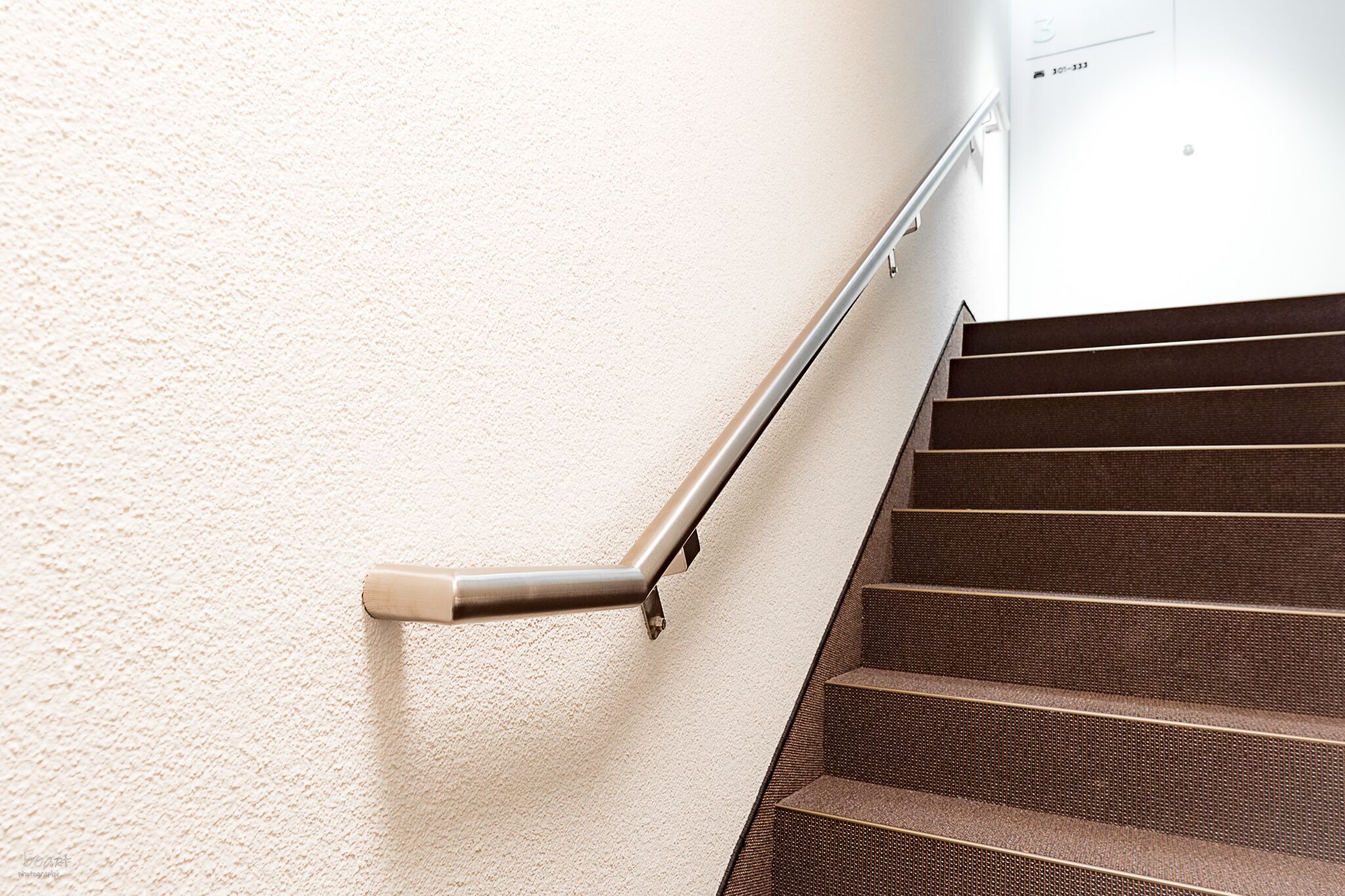 An die Wand montierte Handläufe geben Sicherheit beim Begehen der Steigung oder der Treppe.