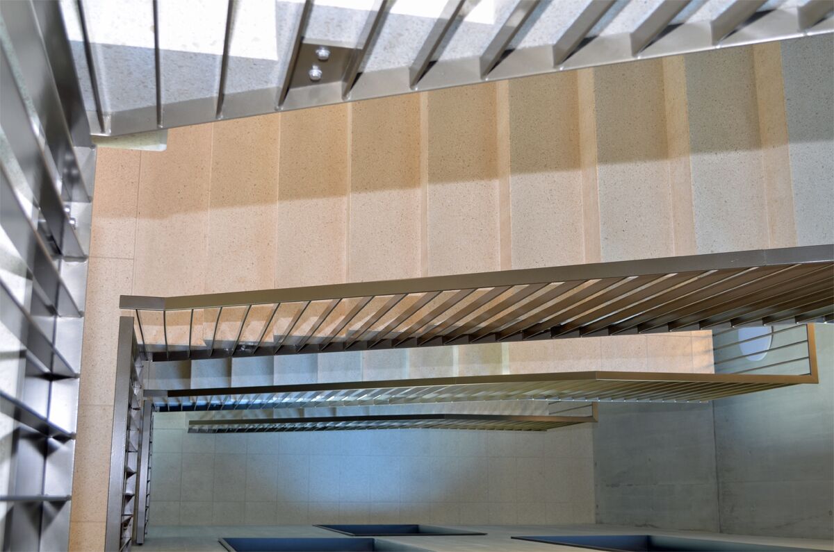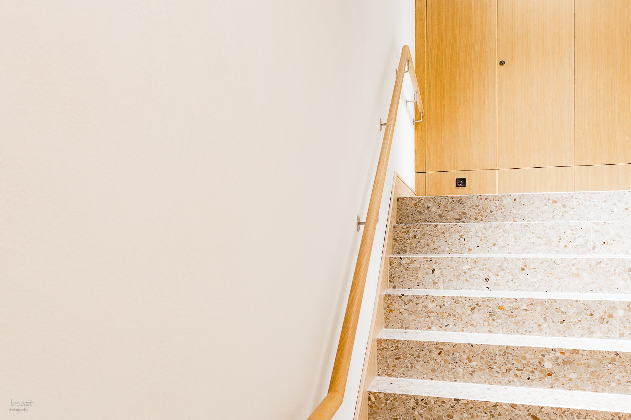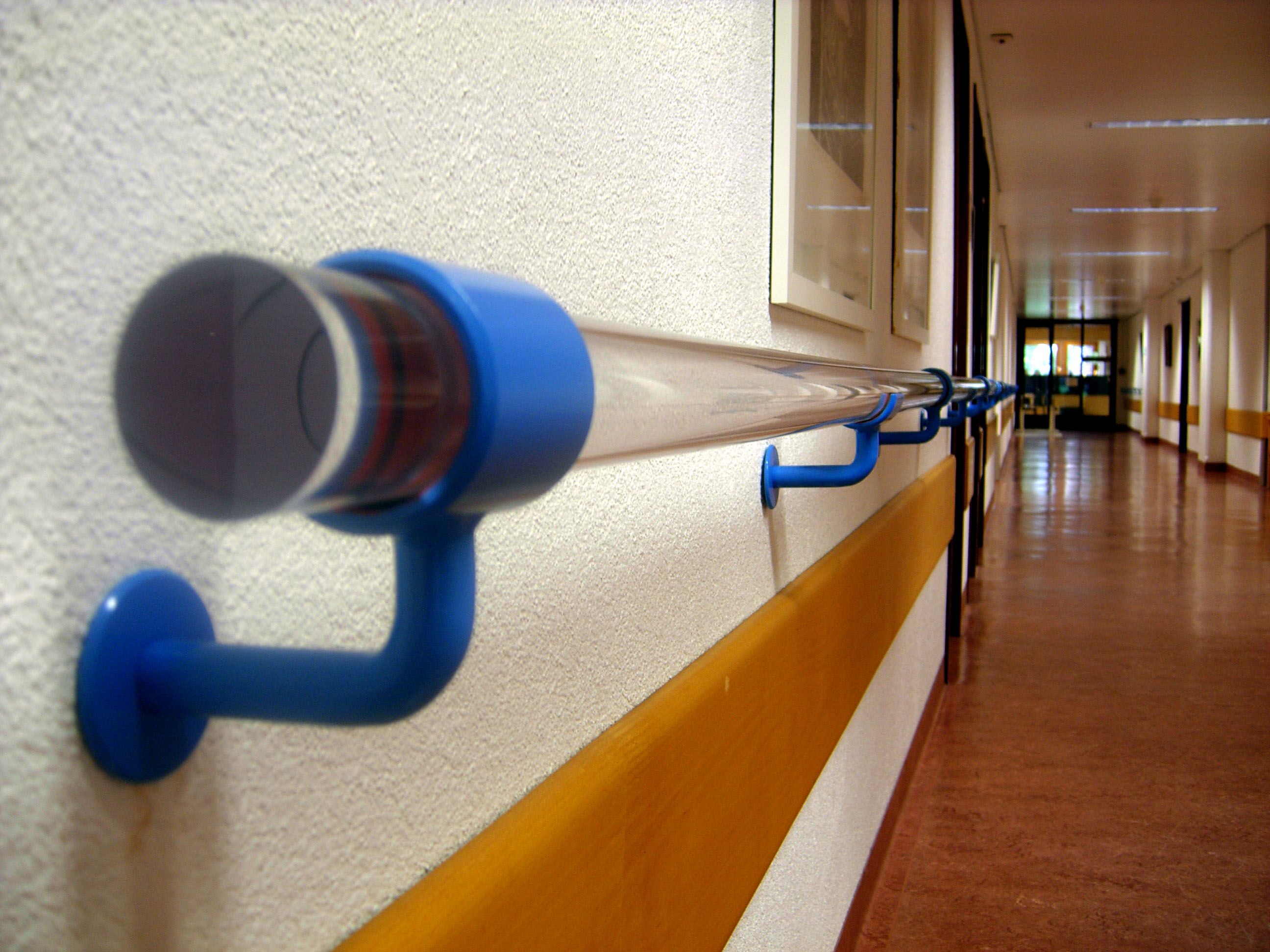 An die Wand montierte Handläufe geben Sicherheit beim Begehen der Steigung oder der Treppe.